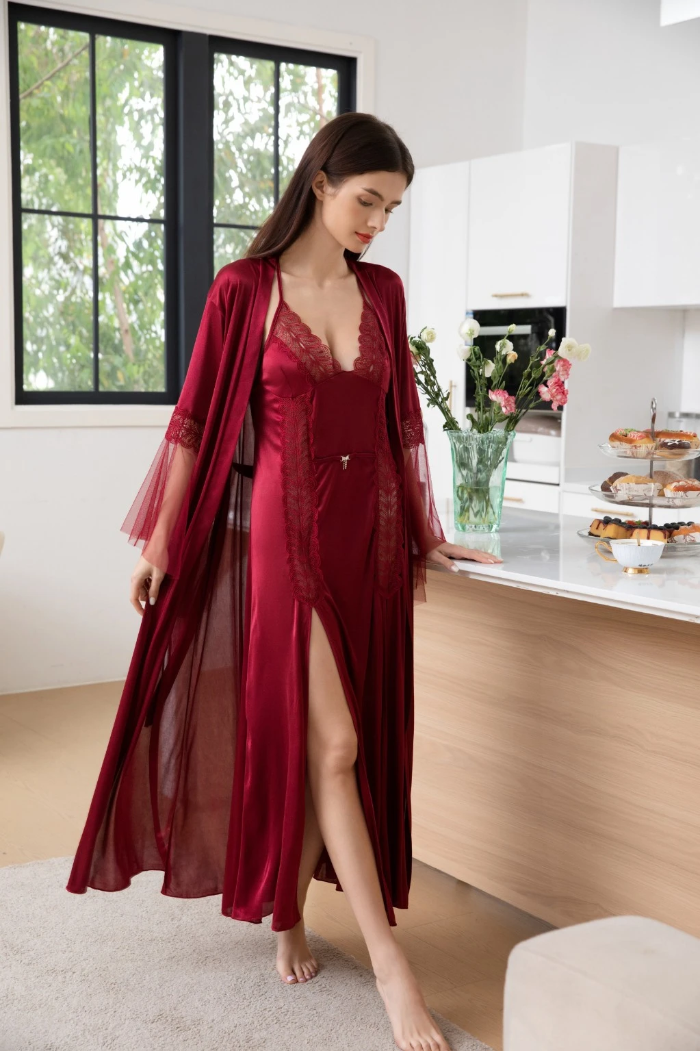 This versatile 2-piece satin nightdress set can be worn in multiple ways. Style the robe alone for relaxed, everyday lounging or pair the nighty with your favorite lingerie for a beautifully alluring nighttime look. Combine both pieces for a polished, elegant ensemble. With endless styling possibilities, you can match the set to any mood – romantic, cozy, or effortlessly glamorous.