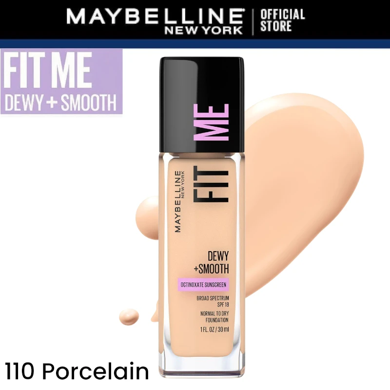 Maybelline Fit Me Dewy + Smooth Foundation 110 Porcelain hydrates very fair cool-toned skin with a radiant, luminous glow. Enriched with SPF 18, this lightweight medium-coverage formula smooths dryness, evens tone, and delivers all-day dewy perfection. Ideal for normal to dry skin, it blends seamlessly for fresh, healthy-looking complexion without feeling heavy.