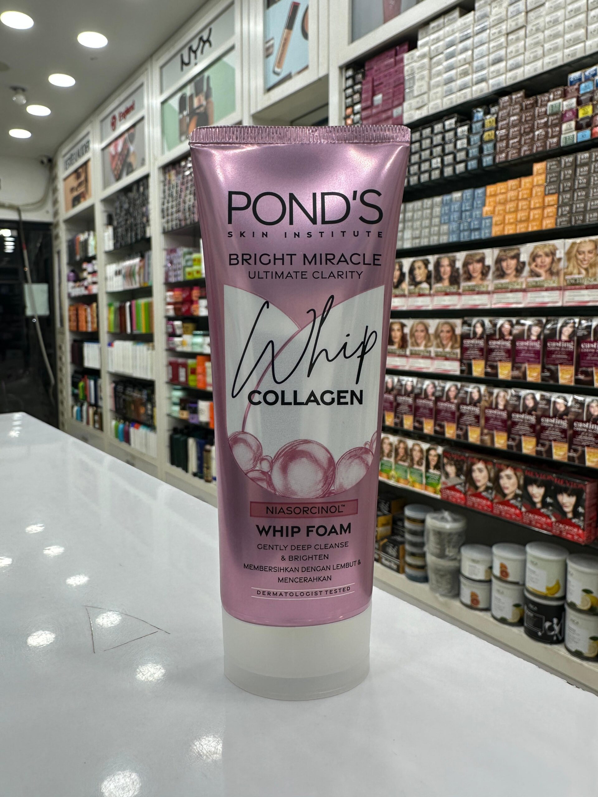 Pond’s Bright Miracle Ultimate Clarity Whip Collagen Facial Foam clarifies, brightens, and smooths with collagen and niasorcinol. Daily use delivers radiant, firm, and soft skin, purifies pores, and evens tone for ultimate clarity and luminous complexion.