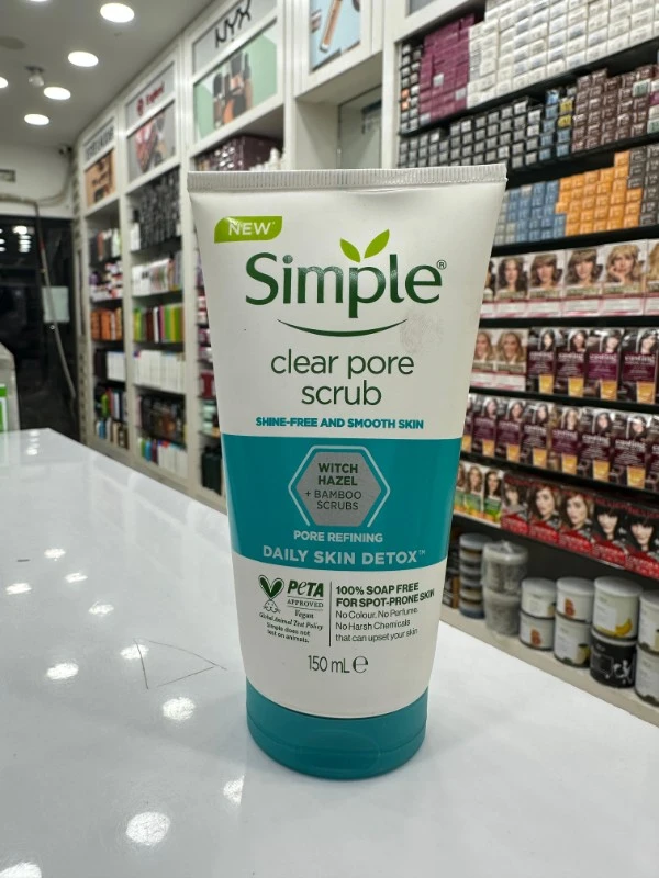 Simple Clear Pore Scrub is a gentle daily exfoliating cleanser designed for oil control and smoother, healthier skin. Enriched with witch hazel and natural bamboo scrubs, the formula cleans deep into pores, helping to detox and refine the skin’s texture. This soap-free, vegan scrub is 100% fragrance-free, color-free, and free from harsh chemicals, making it ideal for sensitive, oily, and spot-prone skin. Dermatologist and PETA-approved, it is perfect for those seeking a non-irritating, daily skin detox that removes excess oil, unclogs pores, and leaves the skin feeling refreshed, soft, and visibly smoother after each use.